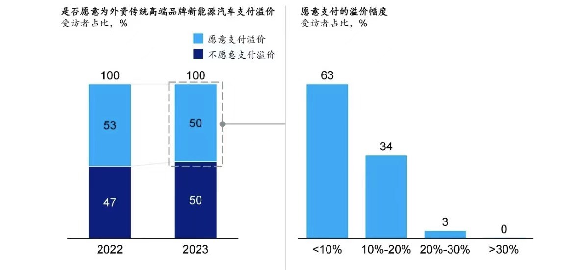 在《2024麥肯錫中國(guó)汽車消費(fèi)者洞察》中顯示,50%的受訪者不愿意為外資品牌支付溢價(jià),相比于無(wú)形的品牌力,消費(fèi)者現(xiàn)在更愛(ài)實(shí)在的技術(shù)與配置。